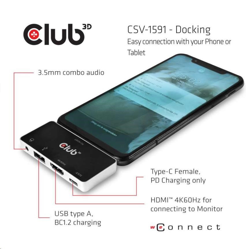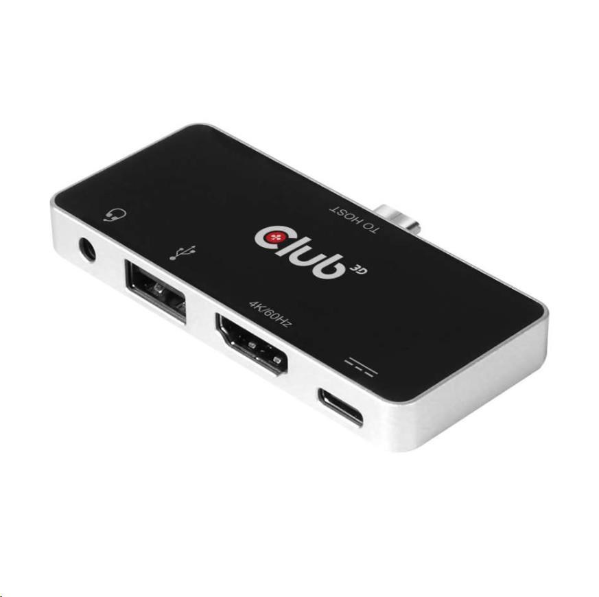 .Club3D hub pro mobilní telefony USB Type C 4-in-1 Hub to HDMI™ 4K60Hz USB Type C PD / USB Type A / Audio jack