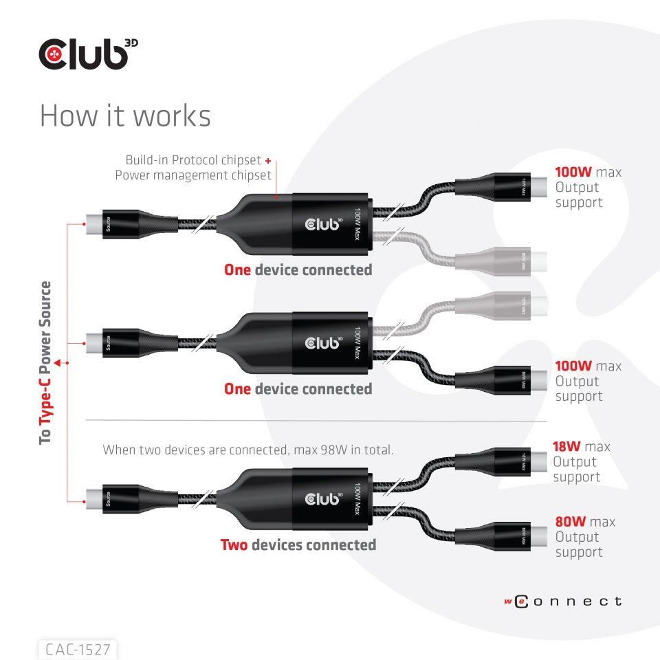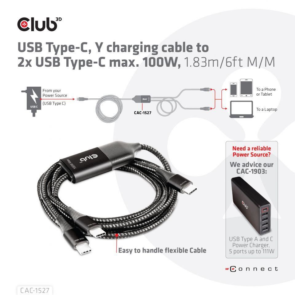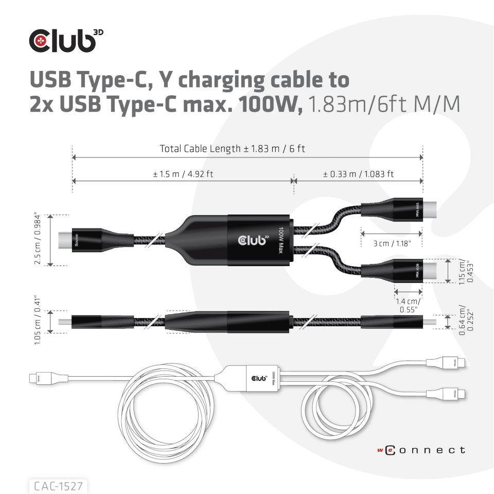 .Nabíjací kábel Club3D USB Type-C, nabíjací kábel Y na 2x USB Type-C max. 100W, 1.83m/6ft M/M