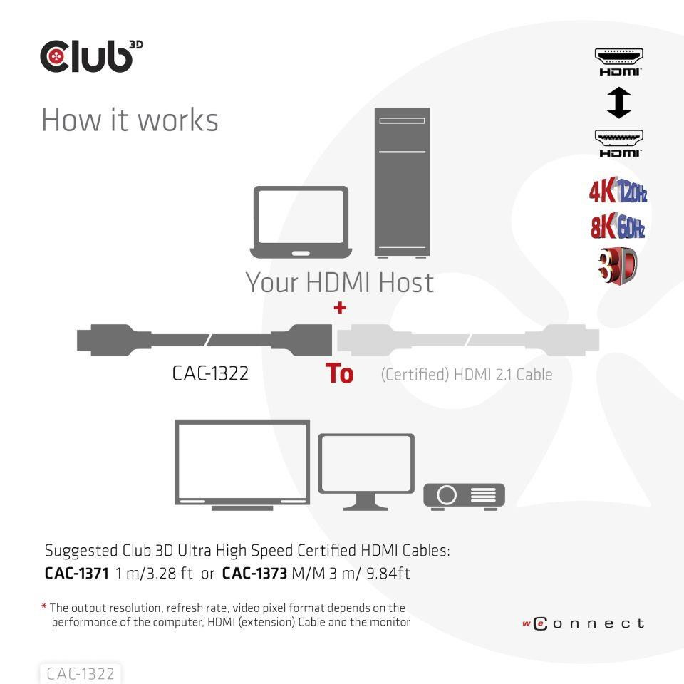 The Club 3D CAC-1322 Ultra High Speed HDMI™2.1 Extension Cable is built to handle the highest quality video- and audio- signals. HDMI™2.1 Increased Bandwidth to 48Gbps.The increase in maximum bandwidth compared to previous versions is achieved by increasing both the bitrate of the data channels (from 6Gbps to 12Gbps) and the number of channels (from 3 to 4). This allows support for resolutions up to supports 4K120Hz or 8K60Hz! New feature included in this Specification is Display Stream Compression (DSC) 1.2, this is used for video formats higher than 8K with 4:2:0.