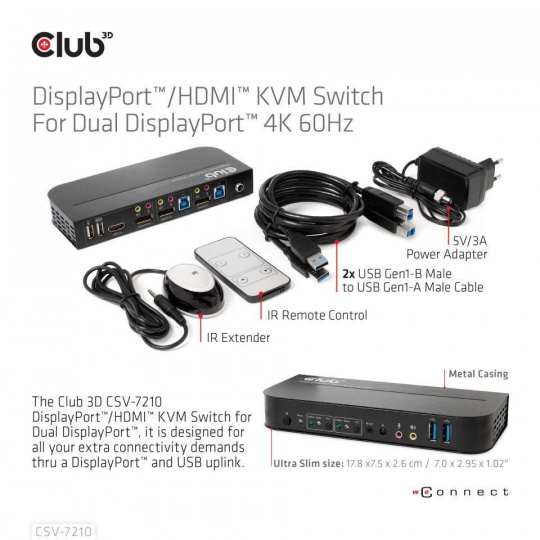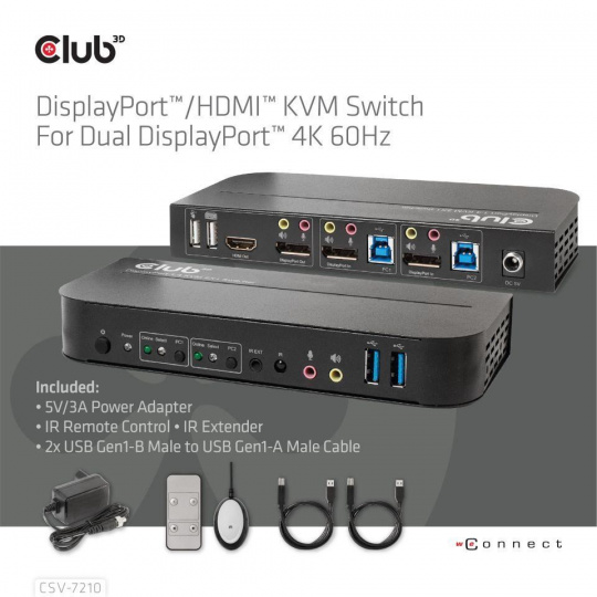 .Club3D Network Switch - Prepínač, DP/HDMI KVM prepínač - Dual DP 4K 60Hz