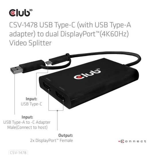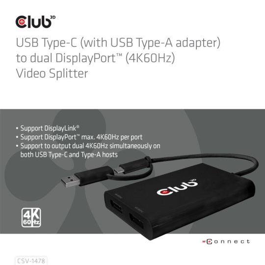 Club 3D CSV-1478 USB Type-C (s adaptérem USB-A) na duálny DisplayPort™ (4K60Hz) Video Splitter s DisplayLink®, ktorý poskytuje najpokročilejšie a najefektívnejšie riešenie. Podporuje max. jeden 4K60Hz alebo duálny 4K60Hz simultánny výstup rôznych videí (Extened Desktop). Môže pracovať v režime USB a režime DP™ Alt s podporou hostiteľov USB Type-C a USB Type-A.