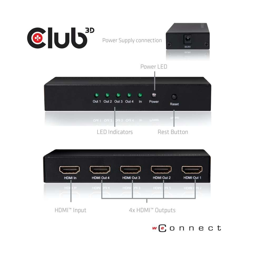 .Club3D Rozdeľovač videa 1:4 HDMI 2.0 4K60Hz UHD, 4 porty