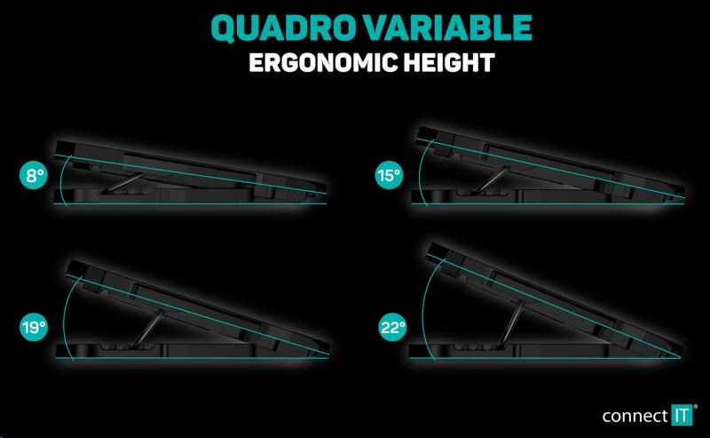 Podložka zabezpečuje odvod tepla z notebooku a jeho vetracích otvorov, ako aj priame chladenie krytu notebooku prostredníctvom cirkulácie chladného vzduchu, čím zlepšuje celkový výkon notebooku. Je plne kompatibilný s notebookmi do veľkosti 15,6" a vďaka kompaktným rozmerom je ideálny na prácu doma a v kancelárii, ako aj na cestovanie a časté prenášanie. Mimoriadne tichá prevádzka 4 ventilátorov vás nebude rušiť ani pri najnáročnejšej práci vyžadujúcej maximálnu koncentráciu. Nastaviteľná výška v 4 rôznych úrovniach zaručuje maximálne pohodlie aj počas dlhšej práce alebo hrania hier.