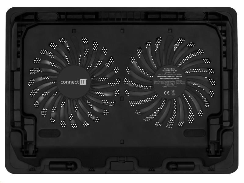 Chladiaca podložka pod notebook CONNECT IT "FrostBreeze" CCP-1910-BK s dvoma ventilátormi s modrým LED podsvietením, celokovovou chladiacou mriežkou a štvorpolohovým nastavením výšky. Kompatibilný s notebookmi do veľkosti 15,6".