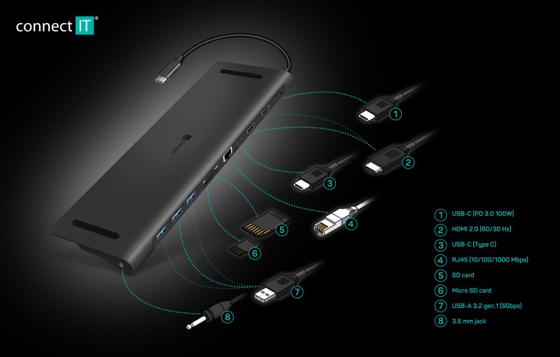 | Výstup | 1x USB-C (podpora 100 W Power Delivery PD 2.0) 1x USB-C (Type C) 2x HDMI 2.0 (4K@60Hz/30Hz) 3x USB-A (3.2 gen. 1 s prenosovou rýchlosťou 5 Gbps) 1x RJ45 Gigabit Ethernet (10/100/1000 Mbps) 1x 3,5 mm jack 1x SD karta 1x MicroSD karta |