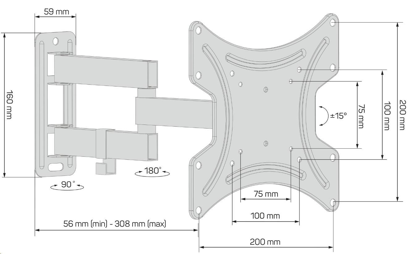 Rozmery držiaka pri maximálnej vzdialenosti od steny (š x v x h): 220 x 220 x 308 mm