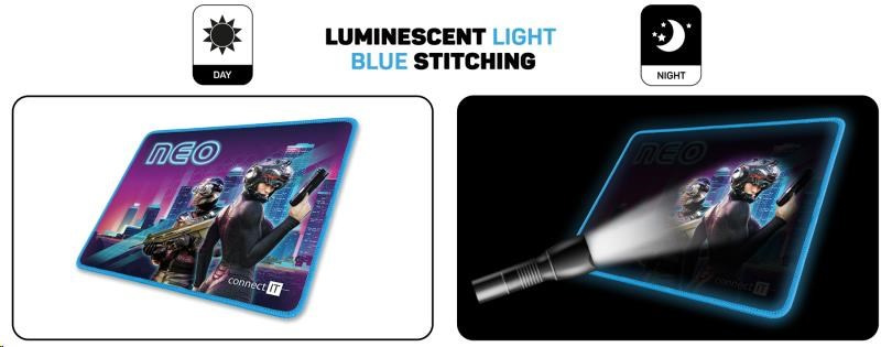 Podložka má mäkký, príjemný povrch s nadčasovou kybernetickou potlačou. Vďaka hracej ploche 320 x 245 mm vám nikdy nebude chýbať priestor na pohyb. Veľkou výhodou je pogumovaná protišmyková spodná strana a antistatický povrch, na ktorom bude bez problémov jazdiť každá myš. Materiál bol navrhnutý tak, aby odpudzoval vodu a nečistoty. Podložka má okraje obšité špeciálnou vysokokvalitnou svietiacou niťou, ktorá v tme jemne svieti.