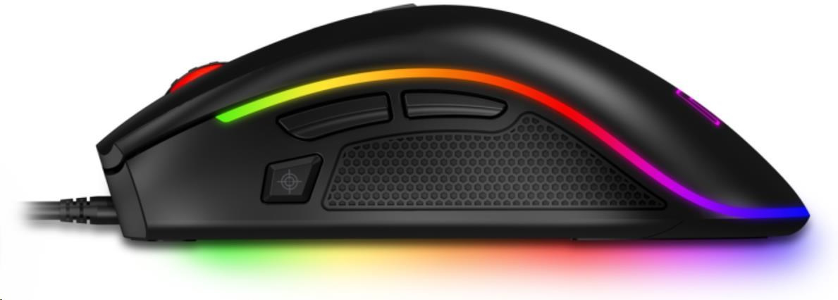 - Špeciálne bočné tlačidlo na prepnutie DPI do režimu "Sniper Mode" (Stlačením tohto tlačidla prepnete na inú úroveň DPI, ktorá je predvolene nastavená na 500 DPI. Druhým stlačením prepnete DPI späť na pôvodnú hodnotu.)