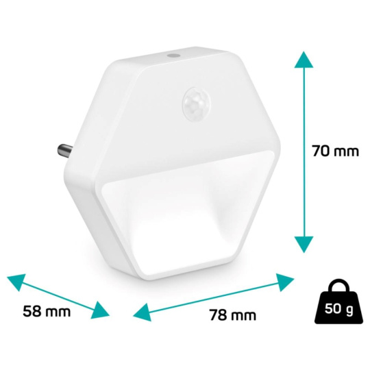 Světlo disponuje posuvníkem, který umožňuje zapnout/vypnout světlo a nastavit režim automatického zapnutí při zaznamenání pohybu v šeru. Světlo stačí jednoduše zapojit do libovolné zásuvky a při příkonu 0,60 W se nemusíte bát spotřeby elektrické energie. LED zdroj světla disponuje světelným tokem 30 lumenů.