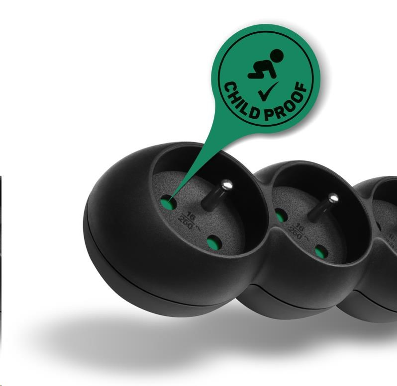 - Detská ochrana pre všetky zásuvky (zásuvky sú prístupné len pri súčasnom vložení oboch vidlíc, takže ich nemožno vložiť jednotlivo, napr. iba skrutkovač alebo pletacia ihla)