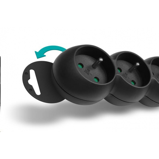 Predlžovací kábel 230 V je vybavený detskou ochranou pre všetky zásuvky - zásuvky sú prístupné len vtedy, ak sú obe vidlice zasunuté súčasne, takže ich nie je možné zasunúť jednotlivo, napr. iba skrutkovač alebo pletacie ihlice. Vďaka otočeniu zásuviek o 45° je možné používať aj objemnejšie napájacie adaptéry alebo uhlové zástrčky. Výsuvná slučka v hornej časti zásuvkového modulu umožňuje zavesenie alebo pevnú inštaláciu na stenu (napr. v dielňach a garážach). Výrobok bol testovaný a certifikovaný európskym skúšobným centrom, spĺňa najprísnejšie bezpečnostné požiadavky a najnovšie normy a umožňuje pripojenie spotrebičov s celkovou spotrebou energie až do 2500 W.