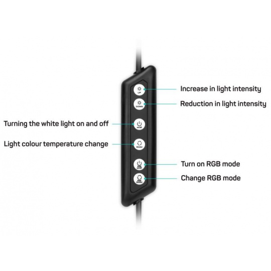 | 24 prepínateľných svetelných režimov | 3 teploty farieb 12 statických farieb 9 dynamických efektov |