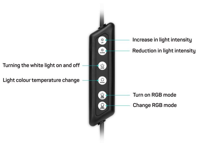| 24 prepínateľných svetelných režimov | 3 teploty farieb 12 statických farieb 9 dynamických efektov |