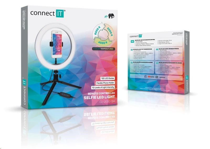 Kruhové selfie LED svetlo "Selfie10Ring" s flexibilným držiakom na mobilný telefón a statívom s guľovou hlavou pre domáce aj profesionálne použitie umožňuje nastaviť farebnú teplotu svetla na 3 rôzne úrovne (3000/4500/6500 K). Súčasťou výbavy je diaľkové ovládanie na kábli.