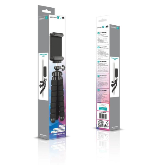 Mini Tripod set s flexibilnými nohami, ktoré je možné prichytiť napríklad na vetvy stromov, zábradlia, riadidlá bicykla alebo na monitor počítača a mnoho ďalších miest a rôznych uhlov. Gumené zakončenie nôh zaručuje stabilitu na akomkoľvek povrchu. Mini tripod set je veľmi skladný a.vmestí sa do každého batohu alebo kabelky, v zloženom stave meria 24,5 cm a váži len 76 g. Maximálne zaťaženie je 0,5 kg. Súčasťou Mini Tripod setu je držiak, ktorý sedí na šírku väčšiny telefónov na trhu a je možné ho v ňom umiestniť ako na šírku, tak na výšku, podľa potreby používateľa.