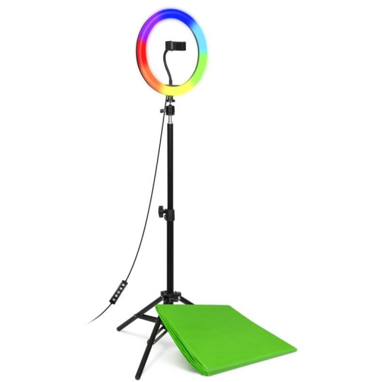 Kruhové selfie LED svetlo "Selfie10RGB" s flexibilným držiakom na mobilný telefón, statívom s guľovou hlavou a diaľkovým ovládaním pre domáce i profesionálne použitie umožňuje nastaviť 7 statických farieb, 8 dynamických efektov a farebnú teplotu svetla v 3 rôznych úrovniach (3200/4300/5500 K).