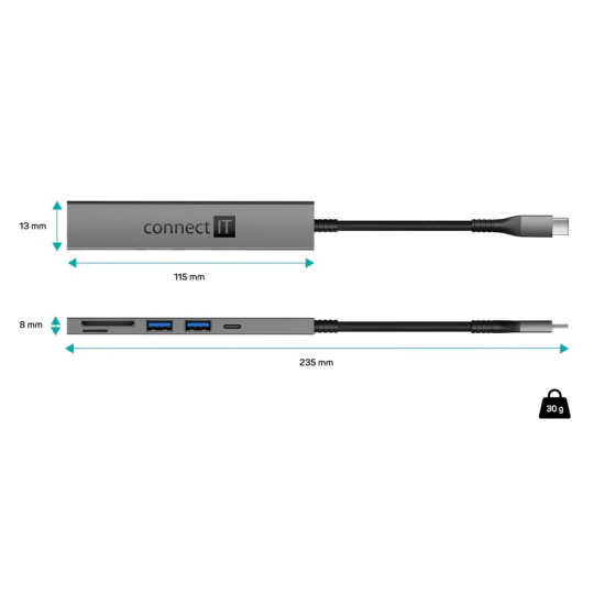 CONNECT IT USB-C hub, 2x USB-A, 1x USB-C, 1x SD karta, 1x MicroSD karta, šedá