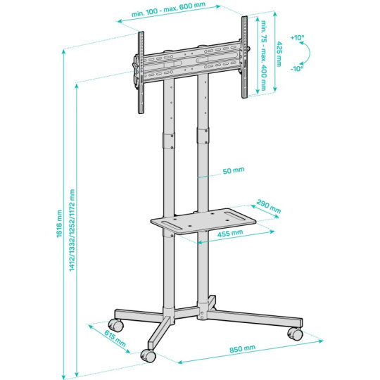 Veľmi praktický pojazdný stojan je určený pre variabilné umiestnenie TV kdekoľvek v interiéri. Vďaka stojanu môžete premiestňovať TV rýchlo a pohodlne kamkoľvek podľa potreby. Navyše je vybavený praktickou poličkou na DVD, Set-top box atď. Robustná konštrukcia z ocele unesie spoľahlivo až 40 kg obrazovku. Policová má nosnosť 10 kg. Stojan je kompatibilný s obrazovkami do uhla do 70" a pre najvyššiu možnú stabilitu je vybavený kolieskami s brzdovou mechanikou proti nechcenému pojezdu.