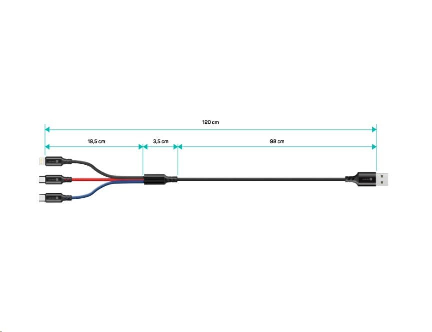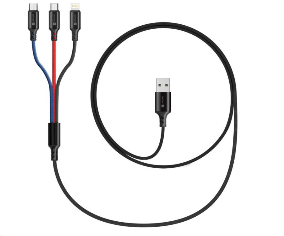 Univerzálny nabíjací kábel 3 v 1 na nabíjanie zariadení s konektormi Micro USB, Lightning a USB-C (typ C) umožňuje nabíjať až tri zariadenia súčasne s podporou rýchleho nabíjania pomocou max. prúd 2 A. Špeciálne predĺženie manžety konektorov Micro USB, Lightning a USB-C (typ C) zabezpečuje lepšiu dostupnosť k nabíjacím portom mobilných telefónov v puzdrách.
