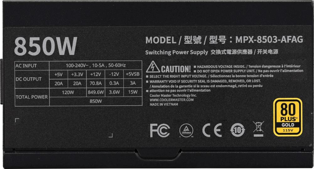 .Cooler Master zdroj 850W MWE Gold 3, 120mm, 80+ Gold, Plně modulární, ATX 3.1