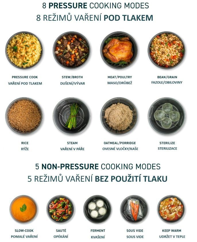 - Tlakové varenie, ryža, para, ovsené vločky/kaša, dusené mäso/vývar, fazule/zrno, mäso/kurča, jogurt, koláč, pomalé varenie, soté, Sous Vide, udržiavanie teploty