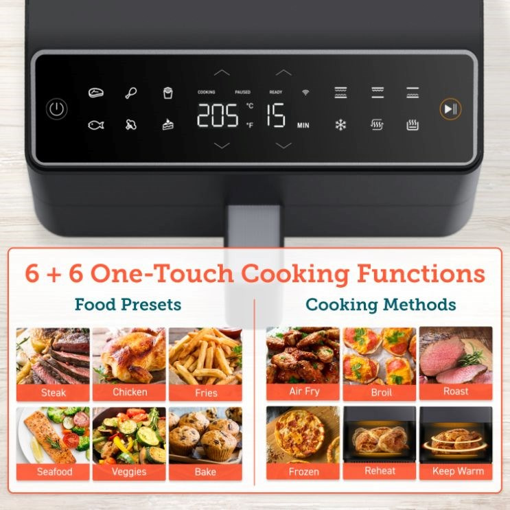 S horkovzdušnou fritézou COSORI CAF-P583S SMART si môžete vychutnať vaše obľúbené vyprážané jedlá bez výčitiek, pretože na rozdiel od bežného vyprážania alebo fritovania je v tejto horkovzdušnej fritéze možné pripravovať jedlá s použitím veľmi malého množstva oleja alebo vôbec žiadneho. Patentovaná technológia THERMO IQ 360° HEAT CIRCULATION presne reguluje teplotu inteligentným teplotným algoritmom a zabezpečuje tak rovnomerné uvarené jedlo bez nutnosti jeho pretierania alebo otáčania. Kombinácia cirkulujúceho horúceho vzduchu, dokonalé teploty varenia a chytrých programov zabezpečí, že hranolky budú vždy krásne chrumkavé a kuracie stehná šťavnaté. Programy si môžete rýchlo a pohodlne nastaviť aj prostredníctvom smartfónu alebo Amazon Alexa a Google Assistant. Až budete mať hotovo, čistenie bude rovnako jednoduché vďaka nepriľnavému košu, ktorý je možné umývať v umývačke riadu. Vďaka veľkej nádobe s objemom 6,4l navyše môžete rýchlo uvariť aj pre väčšiu rodinu alebo skupinu hostí.