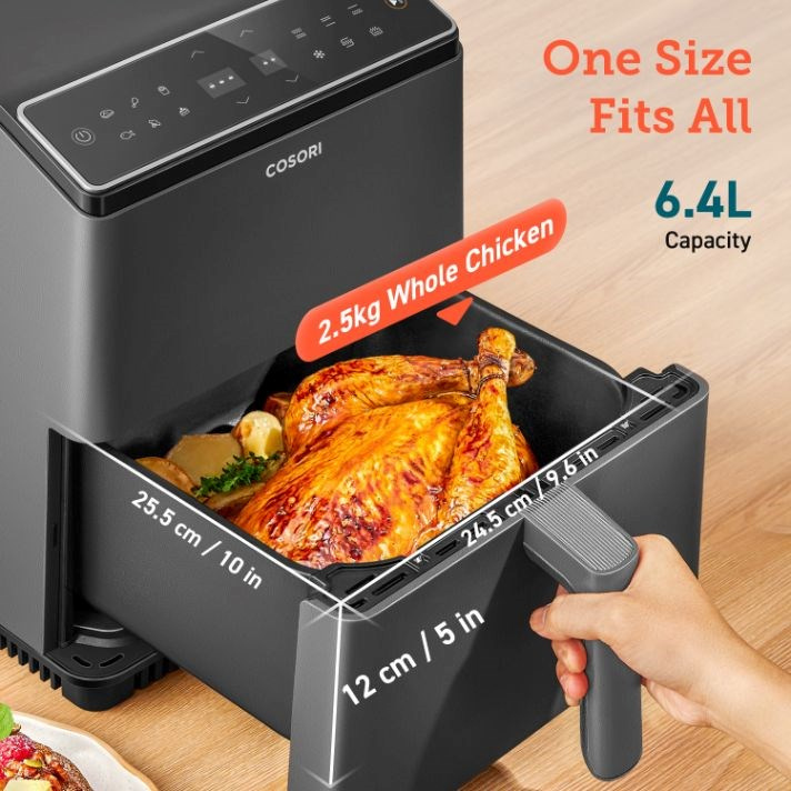 Horkovzdušná fritéza COSORI CAF-P583S sa pýši obrovským objemom koša 6,4 litra s praktickým štvorcovým tvarom, vďaka čomu uspokojí aj početnejšie domácnosti. S výkonom 1700 W je fritéza mimoriadne výkonná, čo skracuje dobu varenia a šetrí elektrickú energiu. Vďaka veľkosti varného priestoru je možné pripraviť napríklad celé 3,5 kg kura v kuse alebo 17 kusov kuracích krídel, ktoré by sa do fritézy s kruhovým košom alebo objemom 3-4l ťažko zmestili.