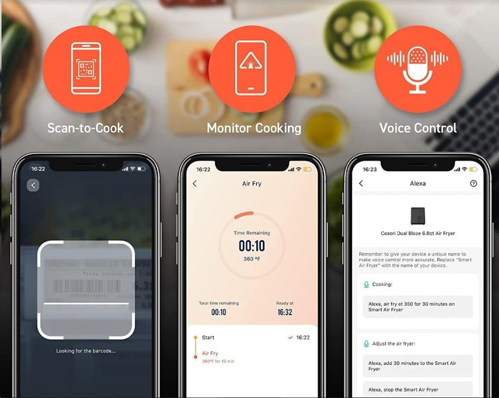 S teplovzdušnou fritézou COSORI CAF-P583S SMART si môžete bez výčitiek vychutnať svoje obľúbené vyprážané jedlá, pretože na rozdiel od bežného vyprážania alebo vyprážania je možné pripraviť jedlo s použitím veľmi malého alebo žiadneho oleja. Patentovaná technológia THERMO IQ 360° HEAT CIRCULATION presne reguluje teplotu pomocou inteligentného teplotného algoritmu, aby sa zabezpečilo rovnomerné uvarenie jedla bez potreby triasania alebo preklápania. Kombinácia cirkulujúceho horúceho vzduchu, perfektnej teploty varenia a inteligentných programov zabezpečí, že hranolky budú vždy krásne chrumkavé a kuracie stehná šťavnaté. Programy môžete rýchlo a pohodlne nastaviť aj prostredníctvom smartfónu alebo Amazon Alexa a Google Assistant. Keď skončíte, upratovanie bude rovnako jednoduché vďaka nepriľnavému košu, ktorý je možné umývať v umývačke riadu. Vďaka veľkej nádobe s objemom 6,4 l môžete rýchlo variť aj pre väčšiu rodinu alebo skupinu hostí.