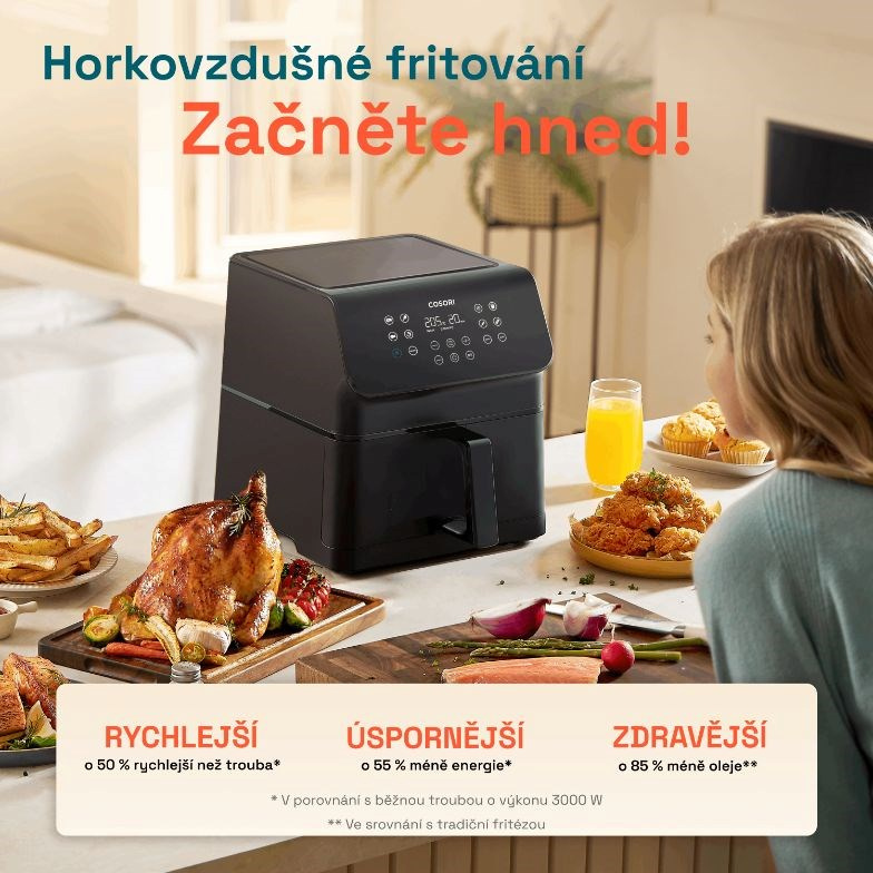 Predstavujeme teplovzdušnú fritézu Cosori P651 Premium II, inovatívne riešenie, ktoré šetrí nielen čas, ale aj energiu a ponúka spôsob varenia, ktorý je šetrný k zdraviu. S teplovzdušnou fritézou si môžete vychutnať svoje obľúbené jedlá pripravené s minimom oleja, vyhnete sa zápachu z vyprážania a čistenie je vďaka košu, ktorý možno umývať v umývačke riadu, hračkou. Fritéza ponúka kôš s veľkorysým objemom 6,2 litra, takže v nej pohodlne pripravíte jedlo pre 3 až 5 osôb, napríklad celé kurča s hmotnosťou 2,3 kg. Pri svojom veľkom objeme si však zachováva malé vonkajšie rozmery, takže je vhodná aj do malých kuchýň. Vďaka technológii 360° cirkulácie vzduchu sa fritéza zohreje na prevádzkovú teplotu do 5 minút, čím sa ešte viac skráti čas prípravy pokrmov. Malý objem znamená aj nízku spotrebu energie v porovnaní s bežnou rúrou. Fritéza ponúka 12 programov na prípravu pokrmov, ktoré možno nastaviť podľa individuálnych chutí. Displej fritézy je prehľadný a pohodlne naklonený pre dokonalú čitateľnosť. V dnešnej digitálnej dobe je atraktívna aj funkcia stlmenia tlačidiel. Ako bonus si môžete stiahnuť elektronickú kuchárku s 80 receptami v českom aj slovenskom jazyku a súčasťou balenia je aj 50 papierových foriem na pečenie.