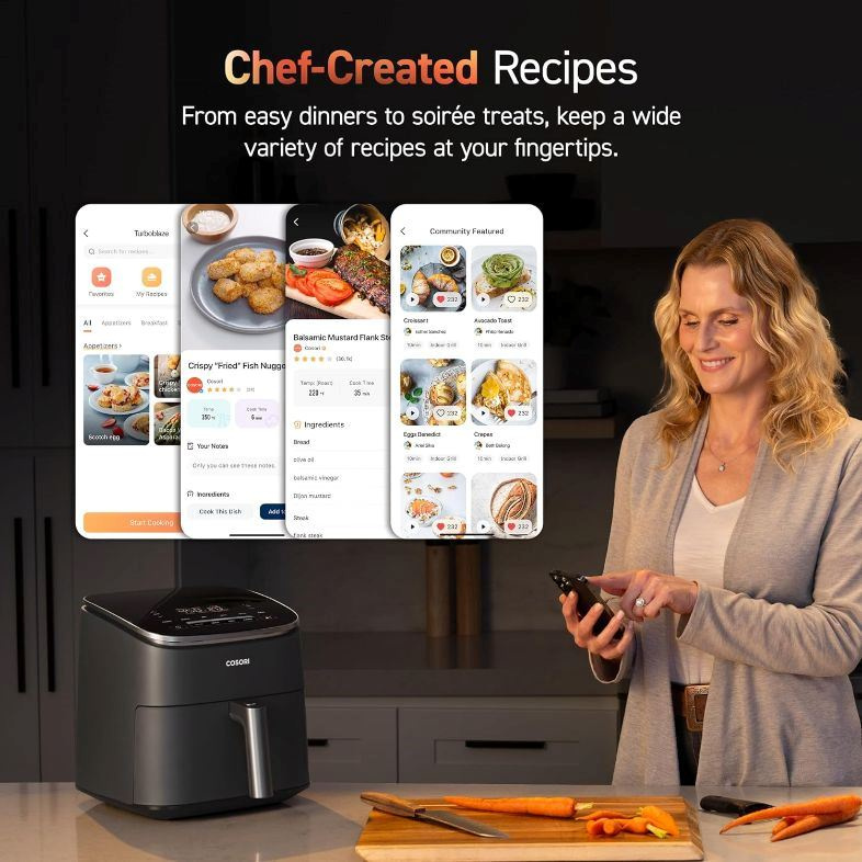 K fritéze Cosori TurboBlaze si môžete stiahnuť našu bezplatnú aplikáciu VeSync, ktorá vám umožní spestrenie vášho jedálnička vďaka viac ako 100 obsiahnutým receptom od našich profesionálnych šéfkuchárov.