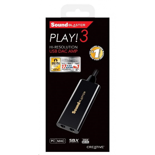 Sound Blaster PLAY! 3 obsahuje USB DAC a zosilňovač a umožňuje rýchlo rozšíriť zvuk vašej základnej dosky. Je vhodný pre počítače PC aj Mac. Obsahuje výkonný zosilňovač pre celý rad slúchadiel: od jednoduchých mobilných slúchadiel do uší až po herné a štúdiové slúchadlá. Softvér Sound Blaster PLAY! ovládací panel 3, ktorý je k dispozícii na stiahnutie, ponúka úžasne realistický zvuk a ohromujúce zvukové efekty. Obsahuje aj optimalizované profily pre vybrané značky slúchadiel.