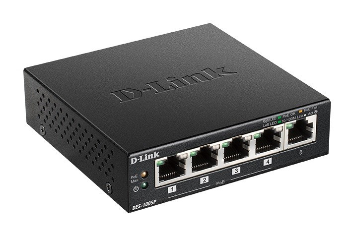 D-Link DES-1005P B1 5-portový 10/100 PoE stolový prepínač, 4x PoE+, 60W pre PoE
