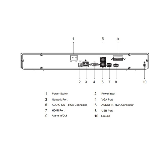 1× 10/100/1000 MbE RJ-45, 1× audio vstup (RCA), 1× zvukový výstup (RCA), 4× alarmový vstup, 2× budíkový výstup, 2× USB 2.0, 2× SATA HDD pozícia (max. 20 TB/disk), 1× HDMI, 1× VGA.