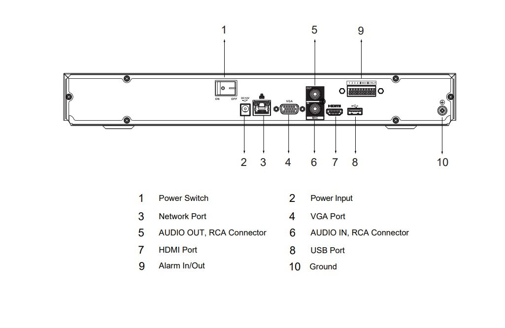 1× 10/100/1000 MbE RJ-45, 1× audio vstup (RCA), 1× zvukový výstup (RCA), 4× alarmový vstup, 2× budíkový výstup, 2× USB 2.0, 2× SATA HDD pozícia (max. 20 TB/disk), 1× HDMI, 1× VGA.