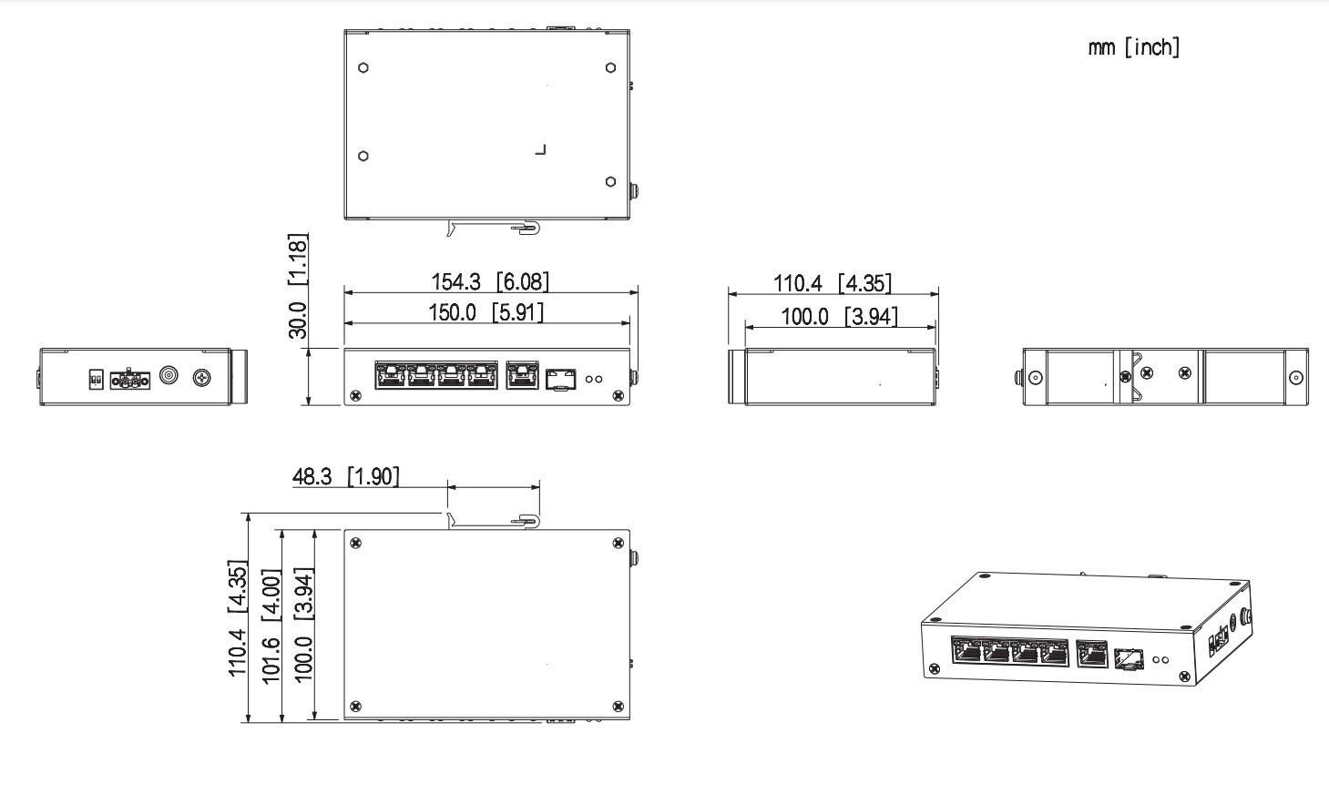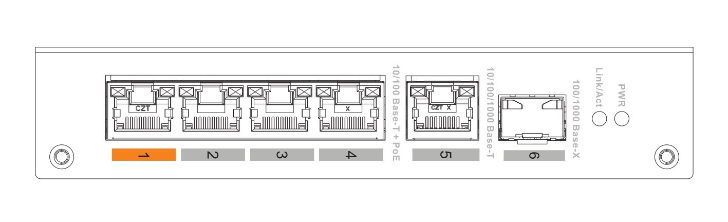 - Port na prenos dát: Port 1-4: 4 × RJ-45 10/100 Mbps (PoE); Port 5: 1 × RJ-45 10/100/1000 Mbps (uplink); Port 6: 1 SFP 100/1000 Mbps × (uplink)