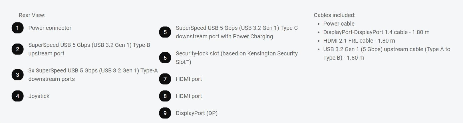 | Napájací kábla ? DisplayPort-DisplayPort 1.4 kábel - 1.80 m ? HDMI 2.1 FRL kábel - 1.80 m ? USB 3.2 Gen 1 (5 Gbps) vstupný kábel (Type A na Type B) - 1.80 m |
