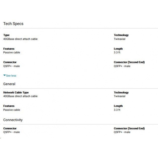 Prehľad Pasívne pripojené medené kábly poskytujú vysoko spoľahlivé komunikačné spojenia s vynikajúcou bit error rate (BER) výkonom. Tieto medené káble sú navrhnuté ako cenovo výhodná a s nižšou spotrebou energie alternatíva k optickým káblovým súpravám pre krátke vzdialenosti medzi aktívnym sieťovým zariadením. Hot Pluggable QSFP+ - formát QSFP+ Priamo pripojené medené kábly Nízka spotreba energie a nízky crosstalk https://www.dell.com/en-us/work/shop/dell-networking-cable-qsfp-to-qsfp-40gbe-passive-copper-direct-attach-cable-1-meter-kit/apd/470-aavr/networking Typ: 40GBase priame pripojenie kábel Technológia: Twinaxial Funkcie: Pasívny kábel Dĺžka: 3,3 stôp Konektor: QSFP+ - samec Konektor (druhý koniec): QSFP+ - samec Kompatibilita Tento produkt je kompatibilný s nasledujúcimi systémami: Dell EMC Networking N2200-ON Dell EMC PowerSwitch Z9264F-ON Dell EMC PowerSwitch Z9332F-ON Dell EMC PowerSwitch Z9432F-ON Dell Networking N3132PX-ON Dell Networking S4112-ON Dell Networking S4128 Dell Networking S4148 Dell Networking S4148U Dell Networking S5212F-ON Dell Networking S5224F-ON OptiPlex GX260 MT PowerEdge C4140 PowerEdge C6420 PowerEdge FC640 PowerEdge M640 PowerEdge M640 VRTX PowerEdge R240 PowerEdge R340 PowerEdge R440 PowerEdge R540 PowerEdge R640 PowerEdge R6415 PowerEdge R740 PowerEdge R740XD PowerEdge R740xd2 PowerEdge R7415 PowerEdge R7425 PowerEdge R7515 PowerEdge R7525 PowerEdge R840 PowerEdge R940 PowerEdge R940xa PowerEdge T140 PowerEdge T340 PowerEdge T440 PowerEdge T640 PowerEdge XR2 PowerVault NX440