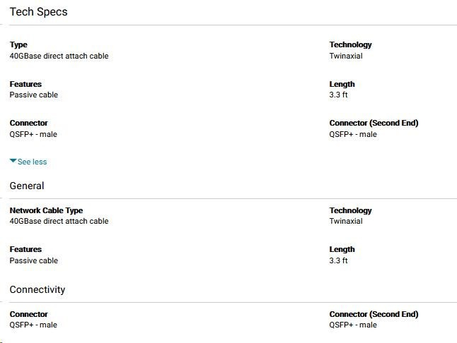 Prehľad Pasívne pripojené medené kábly poskytujú vysoko spoľahlivé komunikačné spojenia s vynikajúcou bit error rate (BER) výkonom. Tieto medené káble sú navrhnuté ako cenovo výhodná a s nižšou spotrebou energie alternatíva k optickým káblovým súpravám pre krátke vzdialenosti medzi aktívnym sieťovým zariadením. Hot Pluggable QSFP+ - formát QSFP+ Priamo pripojené medené kábly Nízka spotreba energie a nízky crosstalk https://www.dell.com/en-us/work/shop/dell-networking-cable-qsfp-to-qsfp-40gbe-passive-copper-direct-attach-cable-1-meter-kit/apd/470-aavr/networking Typ: 40GBase priame pripojenie kábel Technológia: Twinaxial Funkcie: Pasívny kábel Dĺžka: 3,3 stôp Konektor: QSFP+ - samec Konektor (druhý koniec): QSFP+ - samec Kompatibilita Tento produkt je kompatibilný s nasledujúcimi systémami: Dell EMC Networking N2200-ON Dell EMC PowerSwitch Z9264F-ON Dell EMC PowerSwitch Z9332F-ON Dell EMC PowerSwitch Z9432F-ON Dell Networking N3132PX-ON Dell Networking S4112-ON Dell Networking S4128 Dell Networking S4148 Dell Networking S4148U Dell Networking S5212F-ON Dell Networking S5224F-ON OptiPlex GX260 MT PowerEdge C4140 PowerEdge C6420 PowerEdge FC640 PowerEdge M640 PowerEdge M640 VRTX PowerEdge R240 PowerEdge R340 PowerEdge R440 PowerEdge R540 PowerEdge R640 PowerEdge R6415 PowerEdge R740 PowerEdge R740XD PowerEdge R740xd2 PowerEdge R7415 PowerEdge R7425 PowerEdge R7515 PowerEdge R7525 PowerEdge R840 PowerEdge R940 PowerEdge R940xa PowerEdge T140 PowerEdge T340 PowerEdge T440 PowerEdge T640 PowerEdge XR2 PowerVault NX440