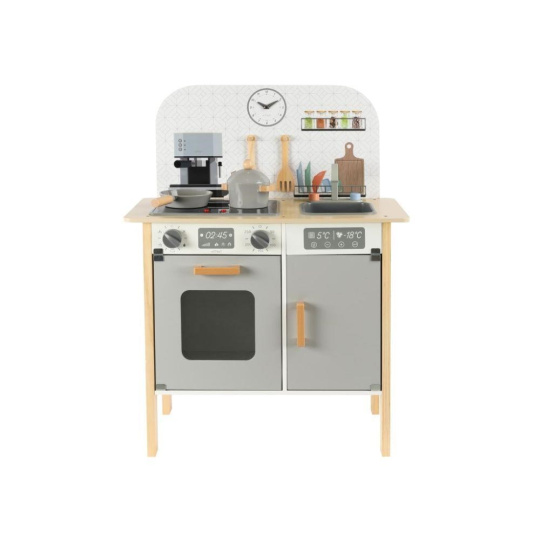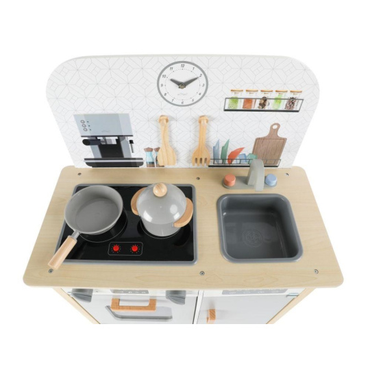 Menšia detská kuchynka v neutrálnych farbách, doplnená o bohaté príslušenstvo a textilný kuchársky set ZDARMA, premení dievčatá aj chlapcov na skutočných kuchárov. Kuchynka v škandinávskom štýle, so spotrebičmi a úžasnými doplnkami, je vhodná do každej miestnosti. Menšia drevená kuchynka je edukatívnou hračkou, ktorá umožní deťom vyskúšať si varenie, pečenie a ďalšie činnosti bezpečným detským spôsobom. Pri hraní v kuchynke deti zdokonalia svoje zručnosti a ešte si užijú veľa zábavy.
