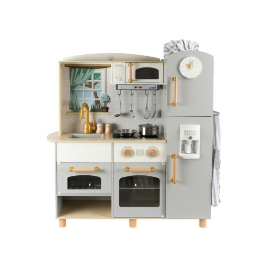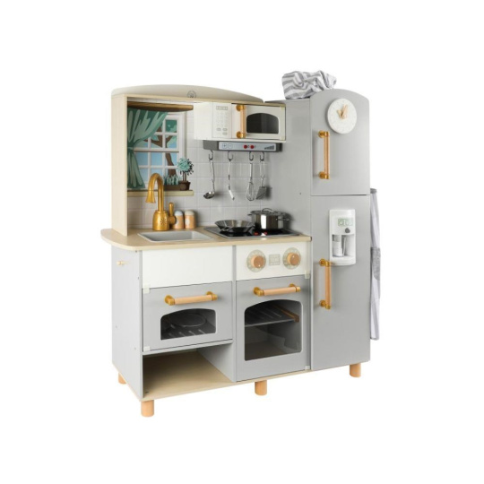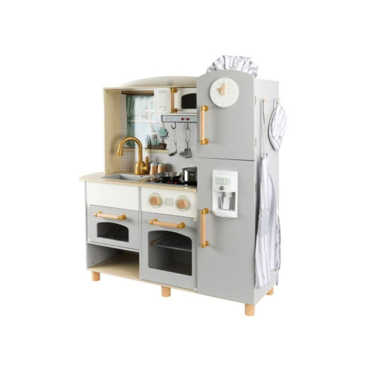 Stylová detská kuchynka doplnená o bohaté príslušenstvo a textilný kuchársky set ZDARMA, očarí malé kuchárky aj kuchárov. Drevená kuchynka v škandinávskom štýle, so základnými spotrebičmi, parádnymi doplnkami a zvukovými efektmi, je vhodná do každej miestnosti. Vďaka tomuto krásnemu edukatívnemu hračke si deti vyskúšajú varenie, pečenie, chystanie jedál, umývanie riadu a ďalšie činnosti bezpečným detským spôsobom. Pri hre v drevenej kuchynke si deti zdokonalia svoje zručnosti a ešte si užijú veľa zábavy.