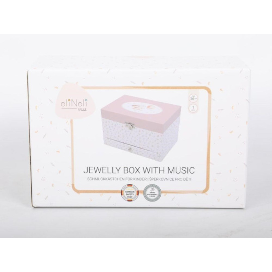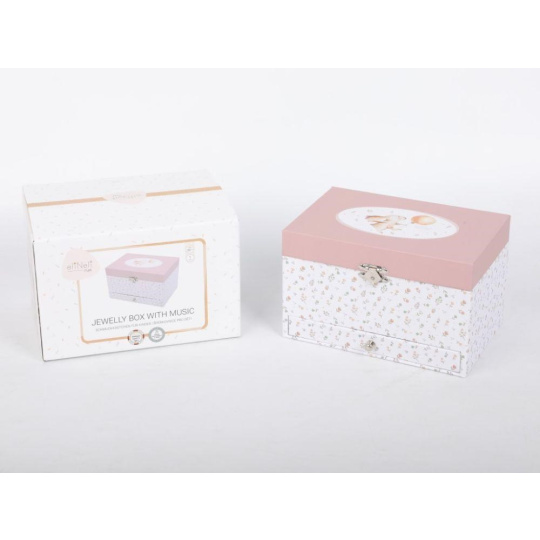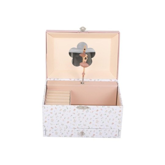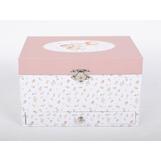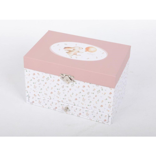 Detská šperkovnica zdobená drobnými kvetmi, s roztomilým zajíčkom na veku, očarí každú malú parádivku. Šperkovnica pre deti, s členitým vnútorným priestorom a praktickou zásuvkou v spodnej časti, ponúka dostatok miesta na uloženie prsteňov, dievčenských šperkov, drobných pokladov. Uvnútri šperkovnice sa ukrýva nielen zrkadlo, ale aj nežná baletka, ktorá vašej dcérke rada zatancuje.