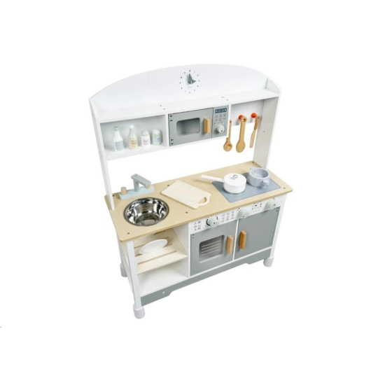 Štýlová drevená detská kuchynka umožní malým kuchárkam a kuchárom vrhnúť sa do varenia a pečenia, prípravy pokrmov a do kuchynských prác priamo vo svojej vlastnej kuchyni. V drevenej kuchynke v krásnom neutrálom farebnom prevedení môžu deti vypustiť uzdu svojej fantázii a premeniť sa na skutočných kulinárskych majstrov. K ruke im budú zabudované spotrebiče aj riad, s ktorým pôjde varenie aj pečenie ako po masle. V kuchynke nechýba pečiaca rúra, mikrovlnná rúra, sporák so 2 platňami, drez na špinavé riady ani hodiny. Pre prípravu chutných pokrmov je detská kuchynka dovybavená rôznymi koreninami. Táto edukatívna hračka umožní deťom vyskúšať si dospelácke činnosti bezpečným detským spôsobom. K náteru sa používajú vodou riediteľné farby, vhodné a bezpečné pre deti. Vďaka pridavným (nasadzovacím) nohám porastie kuchynka s vaším dieťaťom, po pridaní nôh sa celá (teda aj pracovná doska) zdvihne o 6 cm.