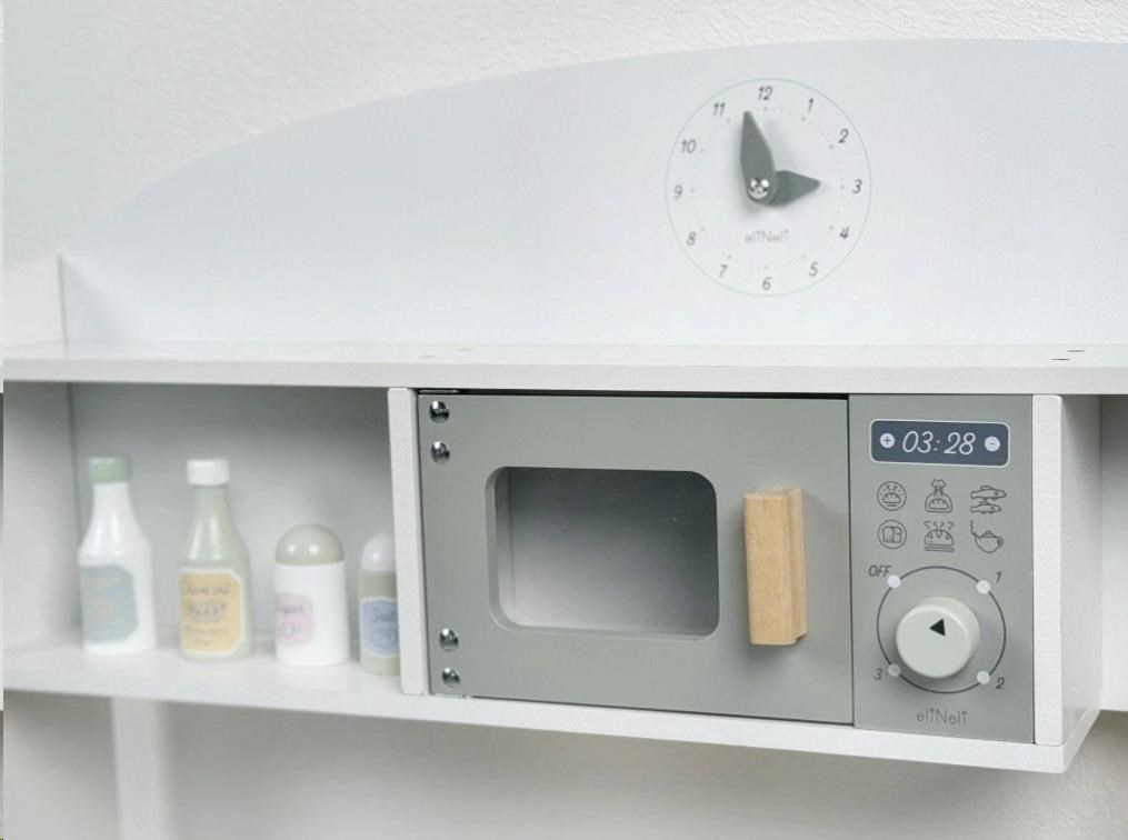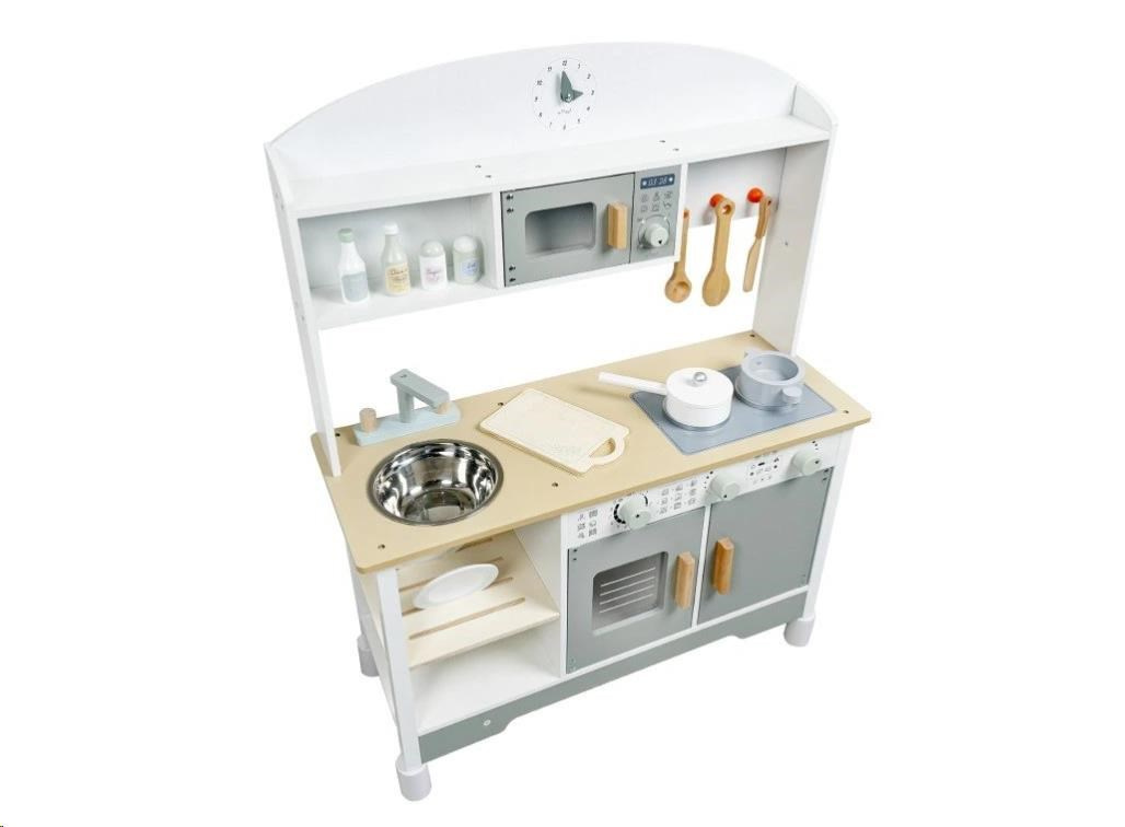 Drevená detská kuchynka v neutrálnej farebnej kombinácii bielej a šedej farby, doplnená bohatým príslušenstvom, je miestom, kde vaše dieťa môže vypustiť uzdu svojej fantázii a kreativite. Detská kuchynka so spotrebičmi aj riadom je edukatívnou hračkou, ktorá umožní deťom vyskúšať si varenie, pečenie a ostatné dospelácke činnosti bezpečným detským spôsobom. Vďaka pridavným nohám (nadstavcom) môžete kuchynku zdvihnúť o 6 cm.