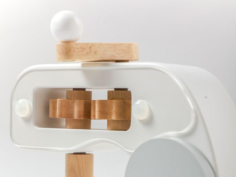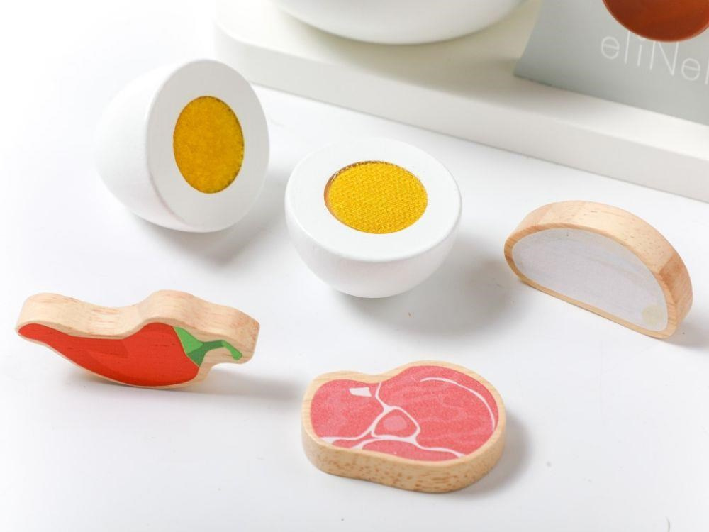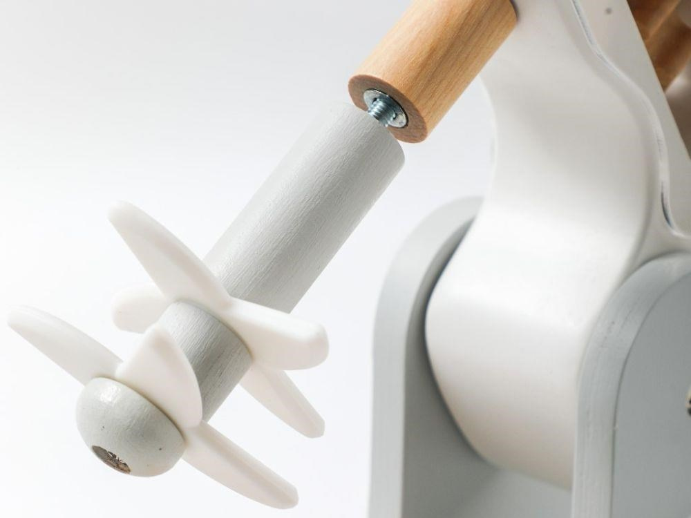Drevený detský mixér v modernej farebnej kombinácii, v sete s dreveným príslušenstvom, je edukatívna hračka, ktorá umožní deťom vyskúšať si prácu s kuchynským robotom bezpečným detským spôsobom. Otáčanie páčky v hornej časti mixéra uvedie mixér do chodu a tým dodáva hračke reálny nádych. Detský mixér s miskou, drevenými ingredienciami a potravinami, krájecim vajíčkom a výmennými nadstavcami nesmie chýbať v žiadnej detskej kuchynke.