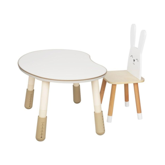 Detský rastúci set nábytku, rastúci stôl a rastúca stolička Králik, je krásnym doplnkom do detskej izby, ktorý bude rásť s vaším dieťaťom. Biele králička bude deťom robiť spoločnosť pri desiatku, tvorivých činnostiach aj pri hre pri oválnom stolíku. Vďaka neutrál tým farbám je detský stolček s stoličkou vhodný pre dievčatká aj chlapcov, do každého interiéru.