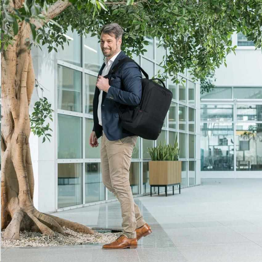 Kompaktný batoh Plus BASE ponúka ideálnu ochranu pre notebooky od 13 do 15 rokov.6" vďaka výplni z peny s vysokou hustotou (HDF). Puzdro plne chráni vaše zariadenie a elastický pásik ho zároveň upevňuje v priehradke. Priestranná hlavná časť je rozdelená tak, aby sa dokumenty a príslušenstvo dali uložiť oddelene. Predné vrecko má praktické menšie priehradky, do ktorých si môžete usporiadať menšie predmety, ako je smartfón, perá alebo nabíjačky. Do skrytej priehradky na zips na zadnej strane puzdra si môžete bezpečne uložiť cestovný pas, peňaženku alebo iné cennosti. V ľahko prístupných bočných sieťovaných vreckách je miesto na fľašu na vodu alebo dáždnik. Môžete si tak byť istí, že všetko, čo potrebujete, máte vždy po ruke. Vďaka ergonomickému polstrovaniu sa batoh pohodlne nosí na chrbte a ramenné popruhy sa dajú nastaviť pre väčšie pohodlie. Batoh Eco Backpack Plus BASE je preto pre vás ideálny, ak ste stále na cestách a chcete podporiť recykláciu PET fliaš ekologickým batohom.