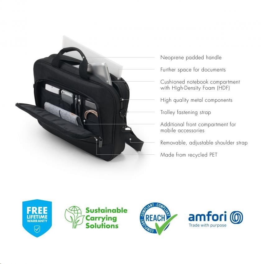 Kompaktné puzdro Eco Traveller BASE ponúka ideálnu ochranu pre notebooky s veľkosťou 15 až 15.6" vďaka výplni z peny s vysokou hustotou (HDF). Puzdro zaručuje extra stabilitu a ochranu vďaka kovovému rámu, ako aj flexibilnú mobilitu vďaka ľahkej konštrukcii. K dispozícii je extra priehradka, do ktorej môžete ľahko uložiť dokumenty. Smartfón alebo iné menšie predmety, ako sú káble, perá alebo nabíjačky, si môžete uložiť do praktického predného vrecka, aby ste ich mali vždy po ruke. Kufrík sa pohodlne prenáša vďaka neoprénovej polstrovanej rukoväti a vďaka zabudovanému popruhu ho možno v priebehu niekoľkých sekúnd pripevniť ku kufru. Kufrík môžete prenášať aj pomocou nastaviteľného ramenného popruhu. Puzdro Eco Traveller BASE je preto pre vás ideálne, ak ste stále na cestách a chcete podporiť recykláciu PET fliaš ekologickým puzdrom.