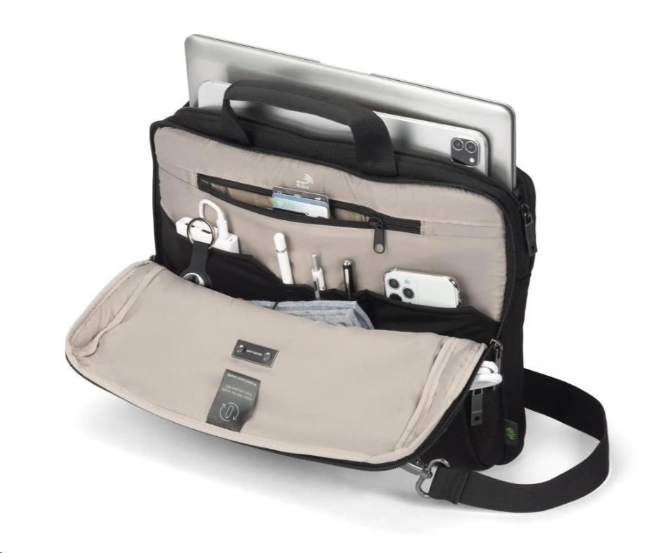Ľahký, bezpečný a navrhnutý pre ľahkú mobilitu, Slim Case FIVE chráni vaše potrebné veci bez toho, aby bol objemný. Uzamykateľná priehradka na notebook s ochranou DCT Notebook Protection zabezpečuje maximálnu bezpečnosť, zatiaľ čo integrovaná kapsa bezpečne udrží tablety do veľkosti až 12,9". Predná priehradka so štruktúrovanými kapsami slúži na usporiadanie príslušenstva a samostatná zadná priehradka poskytuje vyhradený priestor pre dokumenty. Je vyrobená zo 16,5" recyklovaných PET fliaš, takže je udržateľnou a praktickou voľbou pre moderných profesionálov.