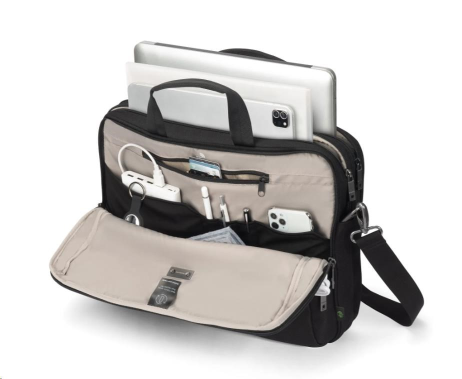 Taška Top Traveller FIVE je navrhnutá tak, aby chránila vaše zariadenie a zároveň vám umožnila jednoduchý prístup k nevyhnutnostiam. Uzamykateľná priehradka na notebook s ochranou DCT Notebook Protection a polstrovaním rohov z HDF peny a EVA zabezpečuje maximálnu bezpečnosť, zatiaľ čo integrovaná kapsa poskytuje bezpečné uloženie tabletov do veľkosti 12,9". Hlavná priehradka ponúka dostatok priestoru pre dokumenty, priečinky alebo mobilné vybavenie a predná časť obsahuje usporiadané kapsy na príslušenstvo. Malá predná kapsa poskytuje ďalší úložný priestor pre káble a menšie predmety. Vyrobené z 23,5" recyklovaných PET fliaš.