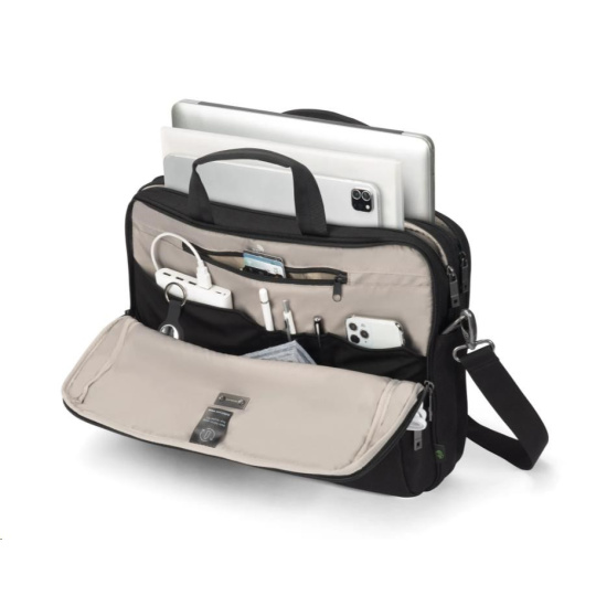 Taška Top Traveller FIVE je navrhnutá tak, aby chránila vaše zariadenie a zároveň vám umožňovala jednoduchý prístup k nevyhnutnostiam. Uzamykateľná priehradka na notebook s ochranou DCT Notebook Protection a vypchávkami rohov z HDF peny a EVA zabezpečuje maximálnu bezpečnosť, zatiaľ čo integrovaná kapsa poskytuje bezpečné uloženie tabletov do veľkosti 12,9". Hlavná priehradka ponúka dostatok priestoru pre dokumenty, priečinky alebo mobilné vybavenie a predná časť obsahuje usporiadané kapsy na príslušenstvo. Malá predná kapsa poskytuje ďalší úložný priestor pre káble a menšie predmety. Vyrobené z 26,5" recyklovaných PET fliaš.